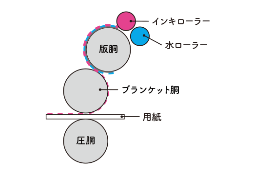 版に付いたインキを一度ブランケットに転写(off)し、そのインキを用紙に転写(set)することからオフセット印刷と名付けられました。