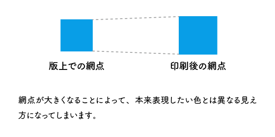 オフセット印刷では、版からブランケット、そして用紙へとインキを転写していきますが、その際、圧力で網点が延ばされたり、印刷後に用紙にインキがにじんだりすることによって、網点が大きくなってしまう現象が発生します。これを「ドットゲイン」といいます。